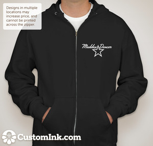 Black, full-zip hoodie with white logo lettering and a glitter dancer on the back.